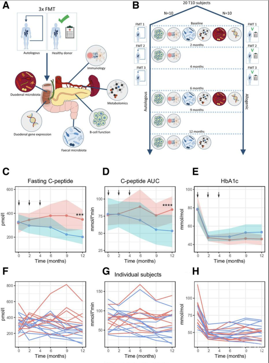 研究人员将发病<6周的T1D(18-30岁)的患者随机分为两组,一组在4个月内接受三个自体或异体(健康供体)FMT治疗,另一组为对照组。主要观察终点是在12个月内通过混合膳食测试评估保留受刺激的C肽释放。次要结果是血糖控制程度,空腹血浆代谢物,T细胞自身免疫性,小肠基因表达谱和肠道菌群组成的变化。