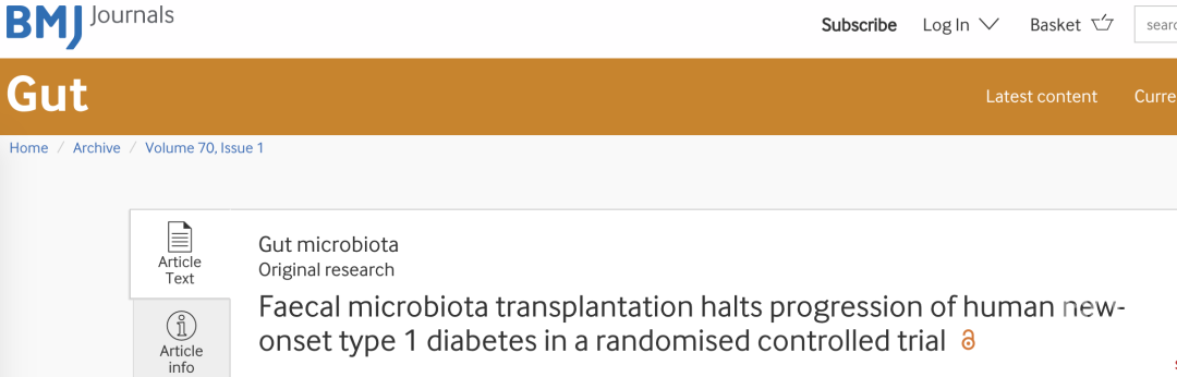 T1D病理生理学与肠道菌群改变有关。在非肥胖糖尿病(NOD)小鼠中的研究表明,肠道微生物与先天免疫系统的相互作用是T1D发育的关键因素,可以通过粪便菌群移植(FMT)和特定微生物来改善。本项研究旨在探究使用粪便微生物群移植(FMT)对1型糖尿病患者疾病进展的影响。