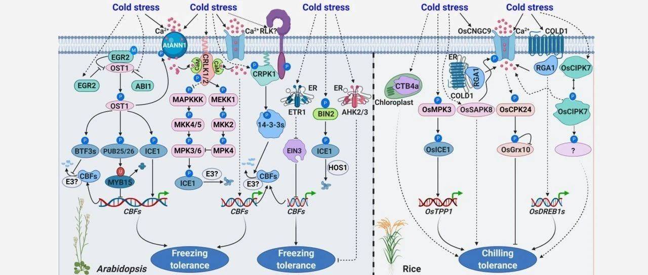 在冷胁迫响应中,综述总结了拟南芥和水稻中参与冷信号感知及传递的蛋白激酶调控网络。