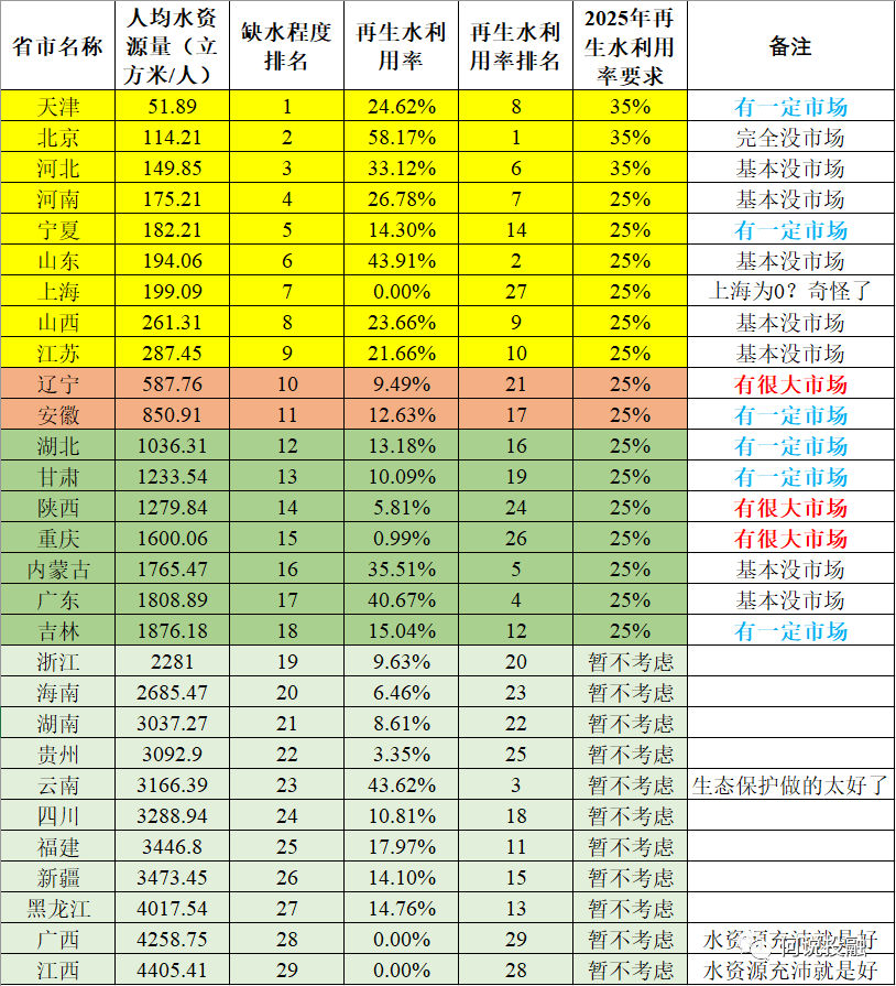 当然有,再生水利用率=再生水利用量/污水排放量,根据住建局统计数据,把各省缺水程度(以人均水资源量为准)与再生水利用率现状、目标进行汇总,结果如下(独家贡献哦):