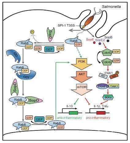 短链脂肪酸(short-chain fatty acids, SCFA)是一类肠道内非常丰富的小分子,包括乙酸、丙酸、丁酸等,主要由肠道内的厚壁菌门细菌对食物中人类无法消化的植物纤维发酵而成。肠道内短链脂肪酸浓度被认为是肠道健康的重要指征,而且它们在肠道免疫系统的发育与调控中发挥着重要作用,因此也对宿主免疫系统对感染的抵御产生影响。然而,短链脂肪酸也可以直接对入侵病菌产生作用,如鼠伤寒沙门氏菌(Salmonella typhimurium),其三型分泌系统(Type III Secretion System)介导的侵染毒性可被丁酸削弱。然而,丁酸抑制三型分泌系统的具体分子机制尚未清楚。