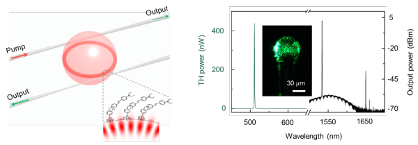 三阶非线性光学效应是现代光学与光子学研究和应用中最重要的非线性光学过程之一,被广泛应用于实现光频梳、全光开关和量子光源等。回音壁微腔由于具有超高的品质因子(Q)和成熟的制备工艺,已经成为非线性光学研究的重要器件。但是,传统高品质因子微腔的材料非线性光学系数一般都较小,制约了微腔器件的性能。具有离域的π电子结构的共轭有机分子是一类优异的光子学材料。这类材料具有非常大的非线性可极化率,在光场激发下,表现出显著的非线性效应。前期研究中,研究人员首次提出利用光学分子表面修饰技术增强与调制高Q微腔非线性光学效应,发现表面分子层可显著增强微腔的光参量振荡过程,促进初级频率梳的产生(《科学》子刊Science Advances, 2018, 4,eaao4507)。