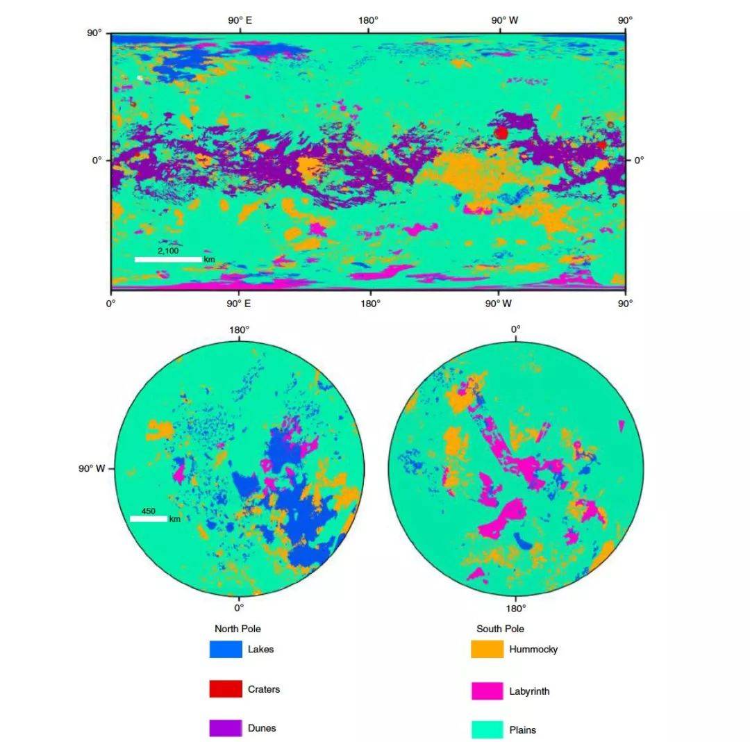 土卫六主要地貌单元的全球地图。地图投影方式为墨卡托投影(顶部图片)和通用极球面投影(底部图片,适用于南北纬55°以上地区)。 | 来源:Lopes et al.
