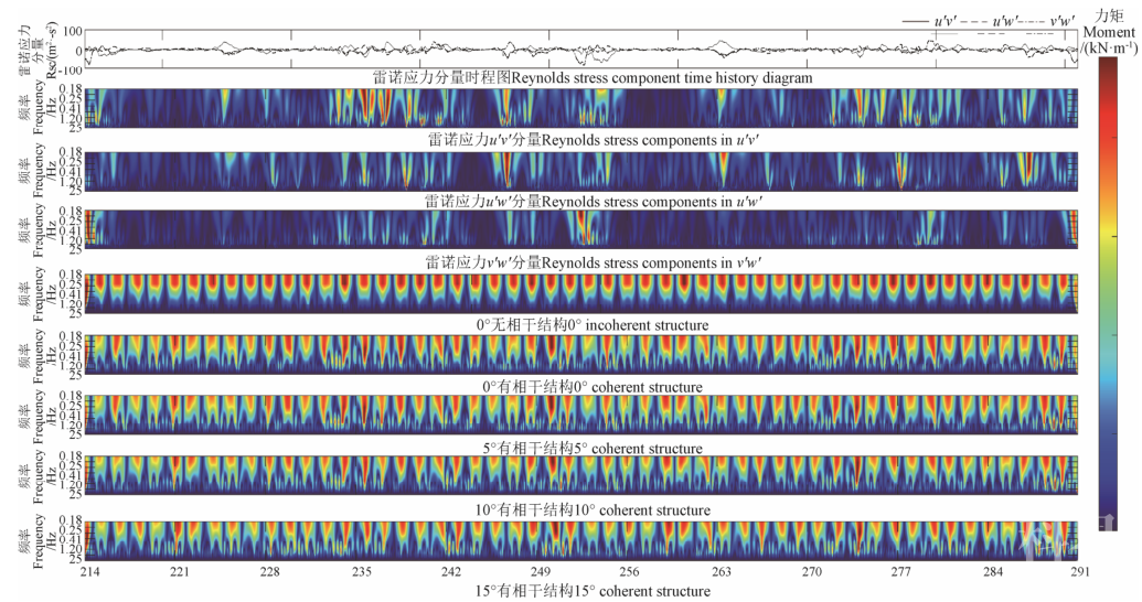 研究表明,湍流相干结构会使风力机载荷的波动幅值和能量增加。偏航角的增大对叶根摆振力矩影响较小,但对叶根挥舞力矩影响较大,并使二者波动程度增强。湍流相干结构使叶根摆振力矩的最大值、标准差平均升高28.30%和0.64%,最小值和平均值平均降低27.28%和1.903%,叶根挥舞力矩的最大值、标准差和平均值平均升高36.27%、59.57%和2.906%,最小值平均降低114.83%。叶根载荷的小波分析表明,湍流相干结构对摆振力矩频域能量影响较小,且能量主要集中在低频段并与雷诺应力的剪应力分量(u′w′、v′w′)对应较好;对叶根挥舞力矩频域能量影响显著,且能量变化与雷诺应力的剪应力分量(u′w′)对应较好,随着偏航角的增大,叶根挥舞力矩频域能量整体升高。对叶片根部进行加固则可以有效提升叶片的使用可靠性。