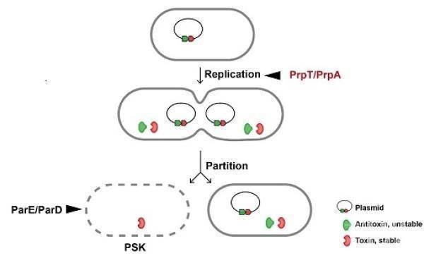 毒素/抗毒素系统(Toxin/Antitoxin System, TA)是较早发现具有稳定质粒功能的二元系统。TA系统在1983年发现存在于接合型质粒上,在功能上被认为通过“分离后致死效应“(Post-segregational killing, PSK)来维持质粒的稳定性。在PSK理论中,当质粒在细胞分裂过程中由于复制或分离错误发生丢失时,在不含质粒的子代细胞中,相对稳定的毒素蛋白会由于失去抗毒素的中和作用,发挥出毒性抑制细胞的分裂或直接杀死细胞,达到在群体中维持质粒稳定存在的目的。ParDE系统是较早支持PSK理论的研究模型之一。随着基因组测序技术的发展,大规模的临床和环境微生物基因组分析发现接合型质粒上富集大量TA系统。2000年,新西兰坎特伯雷大学教授Heinemann研究团队在PNAS的文章中提出了PSK理论的不足,认为质粒上TA系统的富集是质粒与质粒间竞争的结果,并非是通过PSK机制实现的。PSK理论很容易通过在模式细菌中异源表达TA来证实,因此一直被广泛用来作为解释质粒上富集TA系统的理论基础,但仅用异源表达的手段来研究TA的功能存在局限性,容易忽视TA系统的多样性生物学功能。