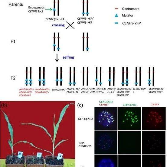 中国科学院遗传与发育生物学研究所韩方普研究组利用玉米CENH3 Mu突变体及YFP-CENH3转基因材料,初步进行玉米CENH3核小体loading的研究。意外得到在6号染色体上的YFP-CENH3转基因材料,玉米CENH3基因也在6号染色体上,通过杂交选育获得6号染色体含有Mutator插入CENH3基因及YFP-CENH3基因的植株,这样为进一步研究CENH3核小体的功能提供新的好材料。因为Mu-CENH3植株如果纯和,无法得到下一代。实验最初的目的是利用外源的YFP-CENH3 fusion蛋白来研究內源CENH3蛋白不存在的情况下CENH3核小体loading情况。杂合植株的体细胞免疫荧光结果表明,YFP-CENH3核小体可以loading到着丝粒区。纯和MU-CENH3/YFP-CENH3d的种子可以萌发,但幼苗生长缓慢,两周左右幼苗枯萎(图b)。这说明玉米着丝粒区的有些功能区无法利用外源YFP-CENH3核小体,必须用內源的CENH3核小体(图a)。