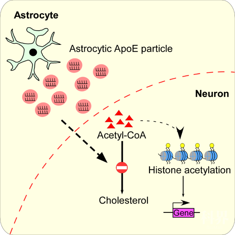 载脂蛋白E(ApoE)是大脑内丰度最高的载脂蛋白之一,同时也是阿尔茨海默症的最大风险因素,但是致病机制一直不清楚。科研人员首先发现了胶质细胞来源的ApoE显著抑制神经元内的胆固醇合成途径上关键酶,从而对神经元的胆固醇合成代谢进行抑制。ApoE通过抑制胆固醇的合成显著累积了胆固醇合成的前体乙酰辅酶A。该研究发现,ApoE可以通过上调细胞核内乙酰辅酶A的水平,显著增加组蛋白的乙酰化水平。神经元的功能,特别是学习记忆等认知功能的实现需要基因表达的精确调控,而表观遗传调控机制,特别是组蛋白乙酰化与该过程密切相关。该研究表明,ApoE通过调控乙酰化组蛋白在启动子区的水平,调控早期应答基因的转录。进一步的研究发现ApoE对神经元的代谢调控是依赖于其所携带的miRNA来实现的。重要的是,ApoE介导的神经元的代谢和表观遗传调控表现为明显的亚型特异性,ApoE4调控神经元胆固醇代谢和表观遗传的能力显著弱于ApoE3。这些结果揭示了ApoE4是通过对神经元代谢和表观遗传的调控参与阿尔茨海默症的病理进程。