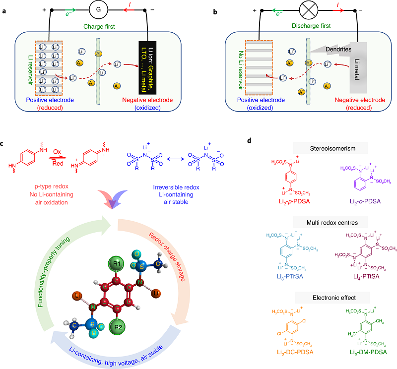 图1 a) 为发色团DR1和DO25的分子结构示意图;b) 静电纺丝示意图;c) 锂离子在薄膜中传输过程示意图;d) 电纺丝诱导发色团分子取向过程示意图。