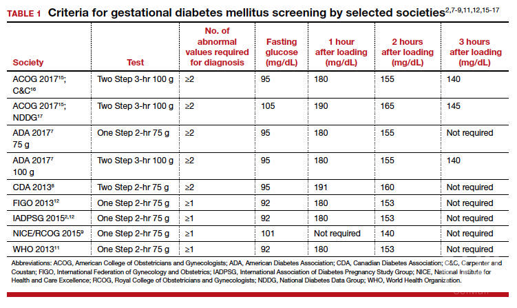 Gestational diabetes mellitus is common and is associated with an increased risk of adverse maternal and perinatal outcomes. Although experts recommend universal screening for gestational diabetes, consensus is lacking about which of two recommended screening approaches should be used.