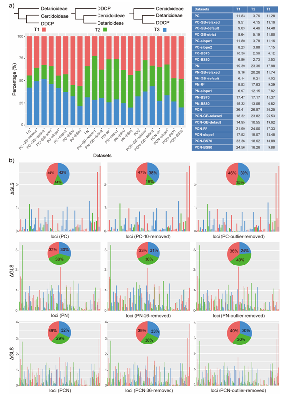 此次在豆科植物类群研究中该团队通过国际合作广泛取样、大规模RNA测序或浅层DNA测序,新获得了391个物种的七百多万核基因转录本的序列数据,结合其他已发表基因序列数据集,覆盖了豆科所有的6个亚科59个族或相当支系的共计463个种。基于八个低拷贝直系同源核基因集系统发育分析,得到了高支持度的豆科系统树,解决了一些长期存在争议或者悬而未决的系统关系。结果表明一些族或支系需要进行拆分,建议成立新的分类单元, 例如之前的含羞草分支(mimosoids)主要包含的三个非单系的族(Mimoseae、Ingeae和Acacieae),该研究提供证据可以考虑将上述三个族重新划分成一个族,命名为Mimoseae s.l.。新的系统树100%支持现有的6个亚科,并且首次解决了6个亚科的深层次系统发育关系,紫荆亚科(Cercidoideae)+甘豆亚科(Detarioideae)作为剩余所有豆科的姐妹群,紧接着分化出来的是单种的亚科山姜豆亚科(Duparquetioideae),最后酸榄豆亚科(Dialioideae)作为包括二个最大亚科云实亚科(Caesalpinioideae)和蝶形花亚科(Papilionoideae)分支的姐妹群。