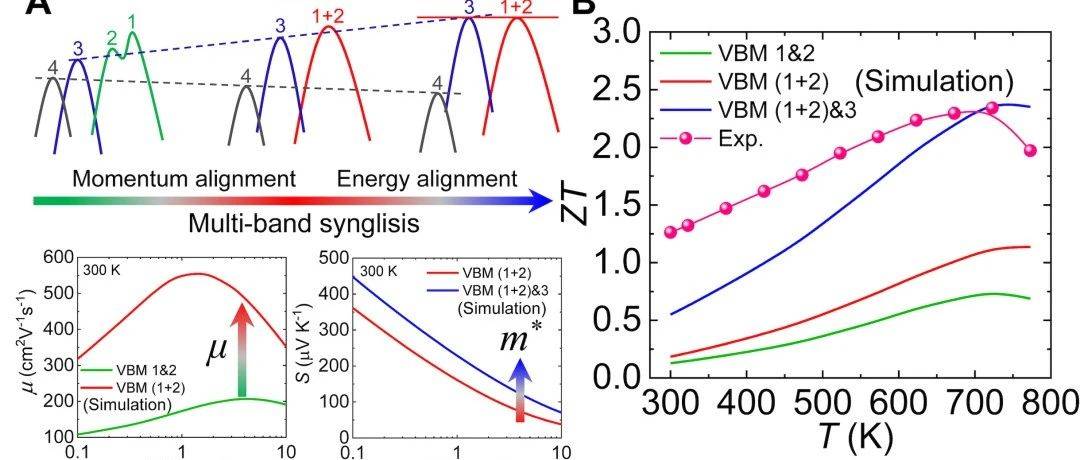 研究团队以p型Bi0.4Sb1.6Te3 (BST)为基体,将具有良好亲水性的Ti3C2Tx MXene通过粉体自组装与BST粉体复合,并结合放电等离子体烧结技术制备得到了Ti3C2Tx均匀分散的Ti3C2Tx/BST复合材料。该方法在实现二维材料均匀分散的同时,成功克服了传统制备方法(球磨法和熔炼法)易造成二维材料结构被破坏的缺点。研究发现Ti3C2Tx的高导电性可以在异质界面处形成空穴注入,增加基体的电导率;同时,MXene的功函数会随着表面端基氧含量的增加而增加,所形成的能带弯曲增强了对低能量载流子的散射,有效抑制了载流子大量注入下的Seebeck系数降低;另外纳米片Ti3C2Tx与BST晶粒间新形成的大量界面又会强烈散射中高频声子,极大降低晶格热导率,最终实现热、电输运的综合调控,提升了热电性能。