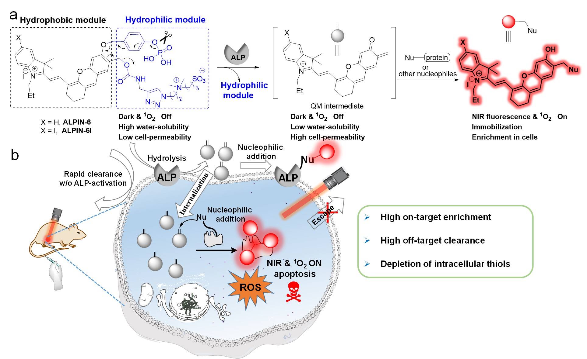 光动力治疗是一种利用特定波长的光激发光敏剂产生活性氧物种以实现治疗的非抗生素新方法。由于其非侵入性和高时空选择性的特点,光动力治疗已经在肿瘤和细菌感染等疾病治疗方面展现出巨大的优势和应用前景。但是,传统的光敏剂的单线态氧效率在水溶液里面往往会降低并伴随着荧光淬灭,从而限制了其在临床上的实际应用。此外,细菌靶向性的缺失也降低了其实际的抗菌效果。因此,一种具有细菌靶向作用,且能在水溶液中依旧保持高效单线态氧产生效率和荧光发射的光敏剂有待进一步开发。