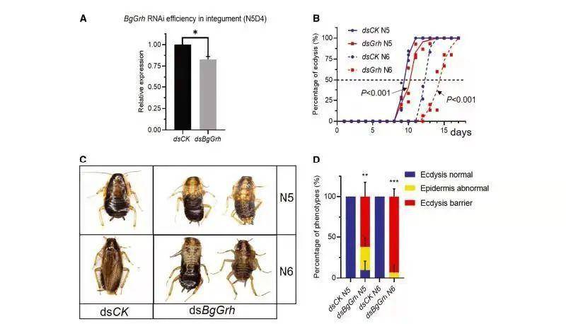 Grh基因RNAi结果表明,德国小蠊5龄和6龄幼虫期Grh信号缺失呈现出不同程度的蜕皮延迟以及蜕皮障碍。