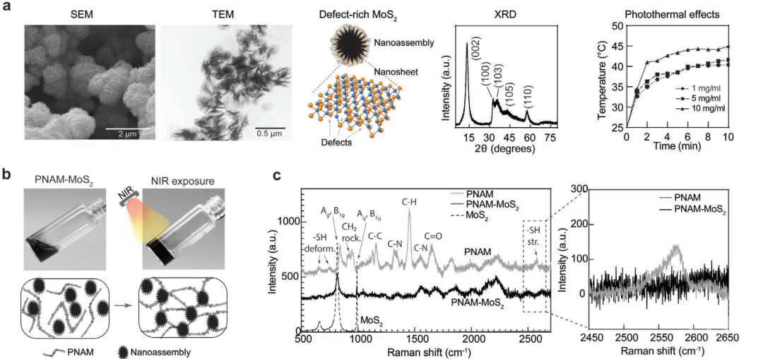 光响应水凝胶是一种新兴的生物材料,可用于各种生物医学应用,包括光热/光动力治疗,再生医学和增材制造等,Akhilesh K. Gaharwar团队提出通过结合NIR响应性二硫化钼(MoS2)与温度响应性聚(n-异丙基丙烯酰胺)(PNIPAm)网络来实现原位凝胶化,如示意图所示。二硫化钼是一类新兴的二维纳米材料,被称为过渡金属二硫族化合物。相对于石墨烯,二硫化钼纳米片具有很强的近红外吸收能力,因此被广泛用于光热治疗。此外,钼是亲硫的,而硫对形成二硫键有很强的亲和力。二硫化钼纳米粒子中原子缺陷的增加可以提供更活跃的结合中心与巯基化聚合物形成水凝胶。因此,通过设计MoS2纳米片中的缺陷,可以将硫醇功能化的PNIPAm偶联,并利用光引发的相变获得原位交联水凝胶。PNIPAm的侧基包含亲水性-CONH-和疏水性-CH(CH3)-基团。在高于较低临界溶液温度(LCST)下,PNIPAm水凝胶可以通过排出水从亲水状态过渡到疏水状态,这种相变行为源于侧基的亲水/疏水性能的动态变化。
