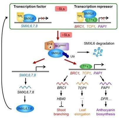 分枝/分蘖不仅是植物发育的基础科学问题,也是影响作物产量的重要株型性状。植物的分枝是腋芽起始之后,进行伸出生长形成的侧枝,这一过程受到多种外界因素和内源激素的严密调控。独脚金内酯(Strigolactones, SLs)是一种新的萜类植物激素,在植物分枝发育中具有重要的调控作用,近几年成为植物科学领域的研究热点。然而,SLs如何抑制单、双子叶植物分枝/分蘖发育的转录调控机制仍有待揭示。