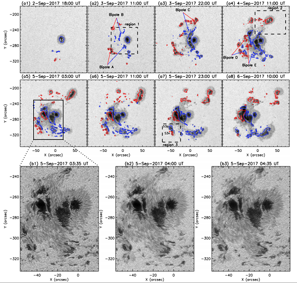他们还通过分析黑子演化过程中黑子速度场的演化进程,发现随着黑子半影的形成,围绕在黑子外围的物质流逐渐出现。在黑子半影衰退过程中,靠近新浮磁流区一侧的物质流速度逐渐变小、消失。同时还发现黑子周围的磁场环境对黑子寿命有影响——耀斑爆发区域附近的黑子寿命较短。
