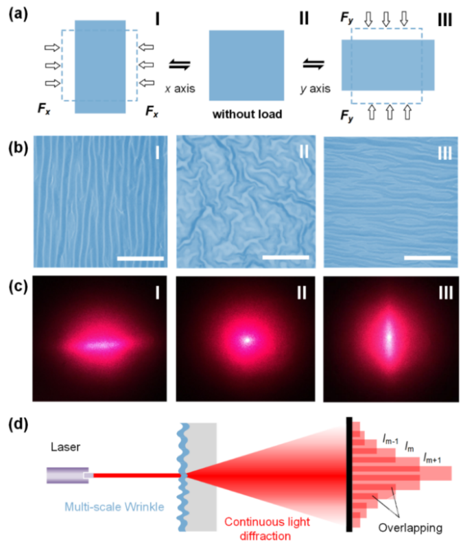 在软的聚合物基底上喷涂一层硬的金属薄膜,然后通过压缩可以在聚合物表面自发形成规则的表面微褶皱图案结构。这种微褶皱金属薄膜在传感器、催化、药物传递、磁性生物标记、光电子和其它领域都有着极大的应用潜力。而形状记忆聚合物(SMPs)由于其形状固定和回复性能,是典型双层褶皱系统中最简单和最有吸引力的软基底替代品。