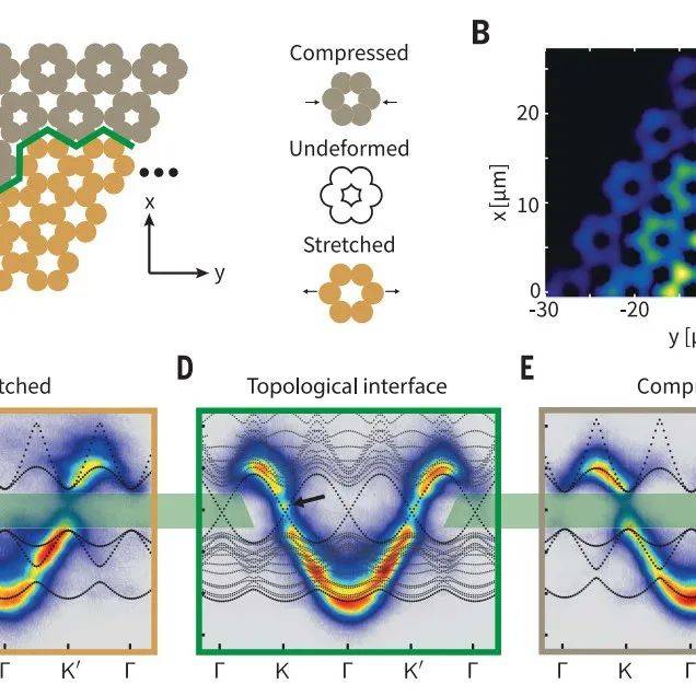 图2a是不同拓扑边缘态之间绝热转化的概念图。参照图2b中的器件,固定δ0同时将θ沿x方向缓慢变化可实现不同拓扑态间的绝热转化。图2c是测量的弹性波传播的空间分布图。图2d是在图2b中A、B、C点处测量的机械振动强度谱。这些测量结果表明可以通过利用轨道自由度将一种拓扑边缘态绝热地转化到另一种拓扑边缘态。