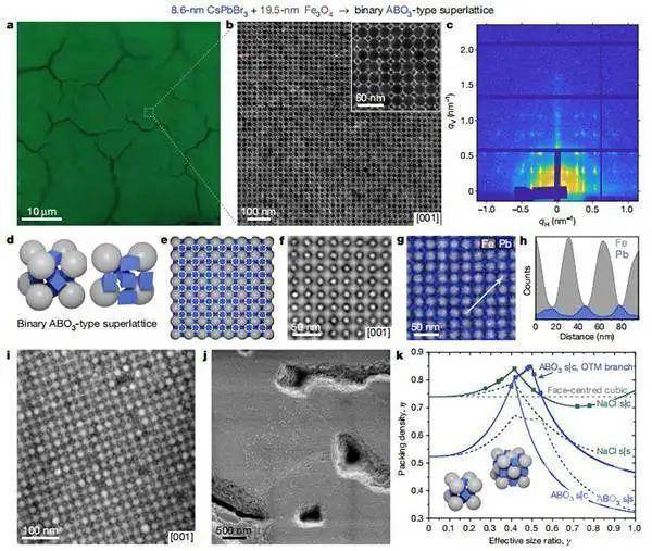 近日,瑞士苏黎世联邦理工学院Maksym V. Kovalenko表明立方和球形空间稳定纳米晶体的共组装在实验上是可能的,而钙钛矿纳米晶体的立方形状导致了与全球形系统相比截然不同的结果。除了预期的NaCl型或常见的AlB2型超晶格外,本文还提出了钙钛矿型(ABO3)二元和三元纳米晶超晶格。在二元ABO3超晶格中,较大的球形Fe3O4或NaGdF4纳米晶体占据A位点,较小的立方CsPbbr3纳米晶体位于B和O位点上。在三元超晶格中,B位点反而被立方体的PbS纳米晶体所占据。立方钙钛矿纳米晶在所有观察到的超晶格中都表现出取向高度有序。本文还证明了这些基于钙钛矿的结构表现出超荧光,导致具有超快辐射衰减(22 ps)的光子爆发,可以针对量子光源进行定制。本文的工作为进一步探索复杂,有序和功能性的钙钛矿介孔结构铺平了道路。