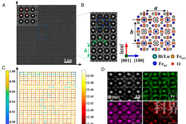 铋和稀土元素,已被确定为铁石榴石结构中的有效取代元素,允许在可见和近红外区域的磁光响应提高几个数量级。人们提出了各种机制来解释这种增强,但由于缺乏合适的实验数据,这些想法的测试受到了阻碍,需要的信息不仅包括取代基原子所处的晶格位置,而且还包括这些原子如何影响各种有序参数。在此,来自清华大学的朱静院士等研究者,通过先进的电子显微镜技术和理论计算,揭示了双取代镥铁石榴石微观结构的变化,是如何耦合到晶格、电子和自旋结构的调制中的。