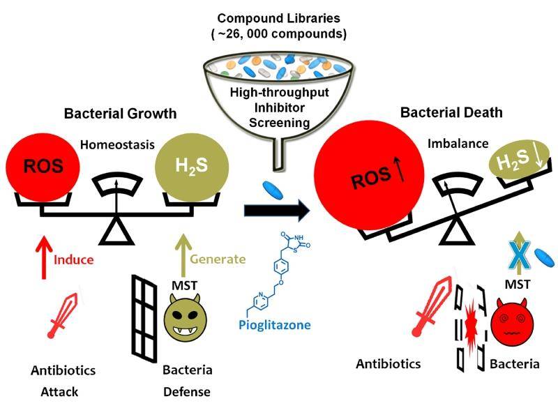 由于几乎所有病菌都会通过哺乳动物胱硫酸裂解酶(CSE)、胱硫酸b合成酶(CBS)等同源酶产生H2S,因此,研究人员首先验证了哪一种酶是产生H2S的主要源泉。经过试验证明,CSE是金黄色葡萄球菌和革兰氏阴性铜绿假单胞菌产生H2S的主要阵地,当缺乏bCSE (bacterial CSE)时,将会导致两种病菌H2S产物的缺失,因此,CSE的失活,将会激发两种病菌对杀菌抗生素的敏感性,从而被抗生素杀死。