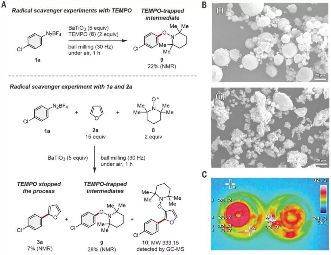 压电材料可以对应力响应从而产生电荷,并且可以高效地将机械能转化为化学转变。因此,它们可以为温和的机械化学提供新方法。压电材料与低功率超声相结合,触发活性物质生成,用于染料降解;亦可用于可控聚合。Kubota等将压电材料钛酸钡用于球磨来触发单电子转移氧化还原反应。作者成功地对各种芳基重氮盐进行了机械氧化还原活化,实现了芳基化和硼化反应。对芳基重氮盐,呋喃和钛酸钡的混合物施加机械力触发氧化还原反应。在球磨过程中,钛酸钡颗粒变形并转变为电荷分离状态。同时充当氧化剂和还原剂。通过单电子转移反应将芳基重氮盐还原为自由基,进一步进行自由基加成合成。电荷分离的钛酸钡颗粒可有效地淬灭自由基加成中间体(见图)。