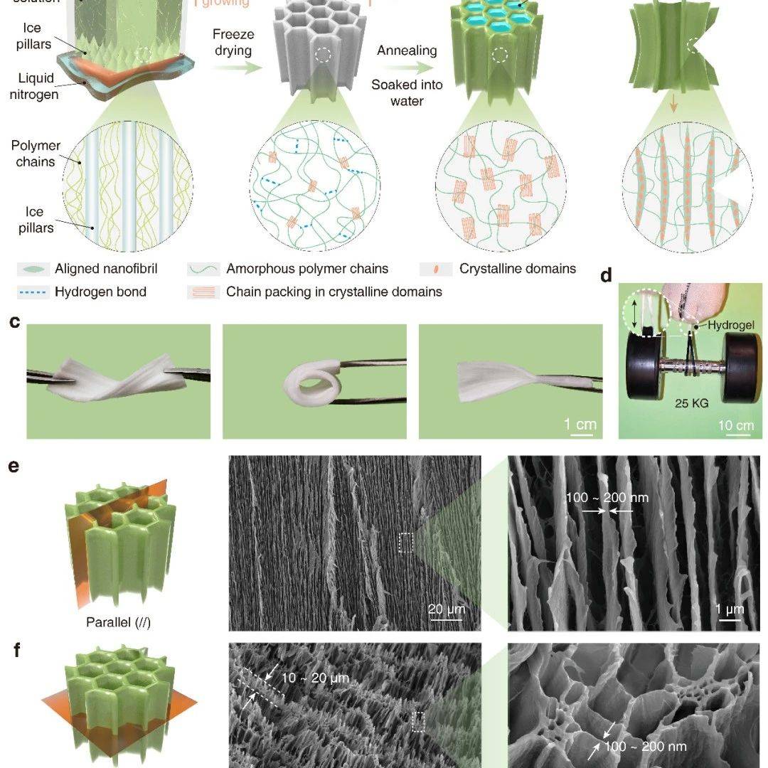 图1. 各向异性抗疲劳水凝胶的制备过程、实物展示和多尺度结构表征。