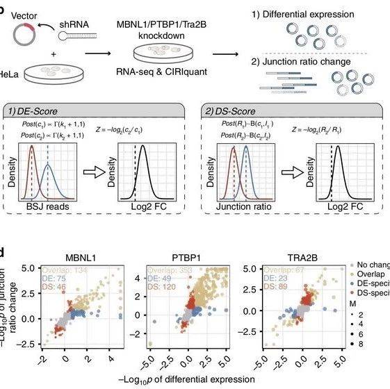 接着,研究团队还通过统计模型,对环形RNA建库过程中常用的RNase R处理效率进行了拟合和校正,从而在RNase R处理后的样本中,消除了RNase R处理步骤引入的偏差,取得了更准确的定量结果。在此基础上,该团队还对环形RNA的差异表达计算方法进行了改进,提出了新的评估表达水平和剪接倾向变化程度的打分方法。