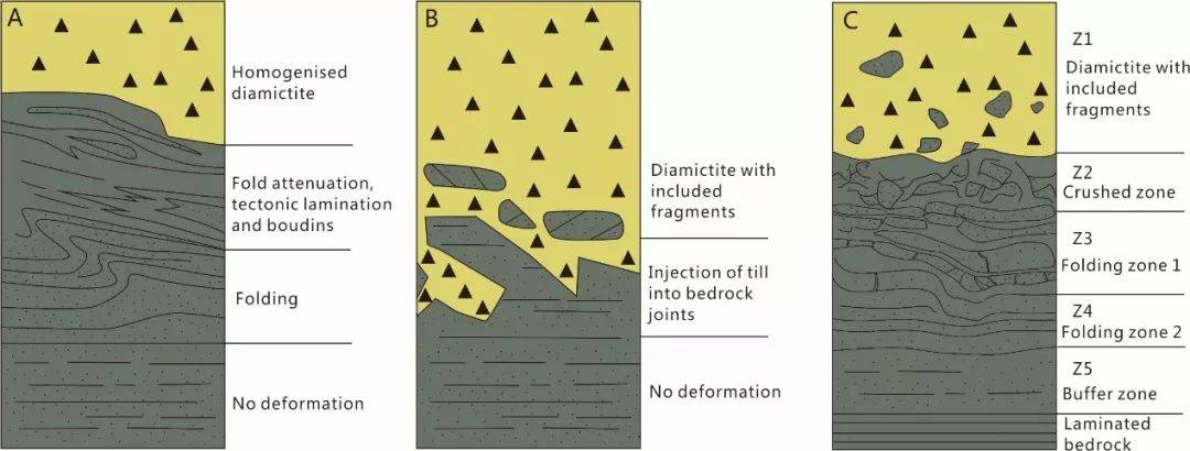 岩相分析结果表明,研究区域的铁丝坳/东山峰组由4种岩相组成,沉积于近端冰海环境(靠近冰盖接地线)。其沉积过程可分为5个阶段:第1阶段记录了冰盖与下伏地层的相互作用,下文提到的冰川构造变形即发生在这一阶段;第2-4阶段代表了冰盖的前进-后退-前进过程,第5阶段为最终冰消期。亦即是说铁丝坳/东山峰组沉积记录了至少两次冰川进退过程,说明该时期的冰盖是不稳定的。