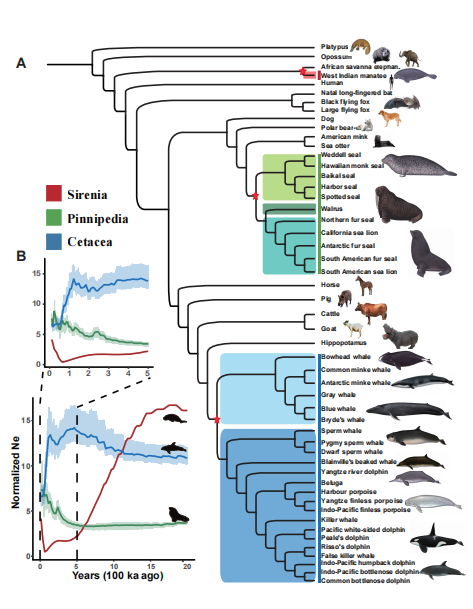图1.海洋哺乳动物的系统发生和种群变化