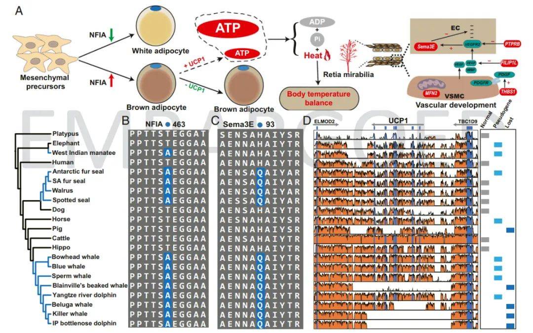 哺乳动物由陆地重返海洋以后面临的重要挑战之一是海水的高导热性。海水的高导热性使得哺乳动物身体的热量更容易向水中散失。海洋哺乳动物如何在水中保持恒温,其遗传基础尚不清楚。该研究发现,不同海洋哺乳动物支系都存在从产热和散热两个方面的改变来进行体温调节以适应水生环境:既通过NFIA和UCP1来调控棕色脂肪细胞的合成和利用从而控制产热的变化,又通过SMEA3E基因的改变从而使得海洋哺乳动物的血管系统发生适应性改变以调节热量的散失,双重调控最终实现维持体温恒定(图2)。