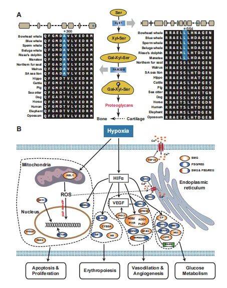 海洋哺乳动物为了适应水生环境,其骨骼形态也发生了不同程度的改变:前肢变成鳍状肢,身体呈流线型或者纺锤形。该研究发现与骨骼发育密切相关的蛋白聚糖的生物合成途径中,XYLT1和FMA20B两个关键基因在海洋哺乳动物中发生了特异性改变(图3),这极有可能会影响到海洋哺乳动物骨骼形态的变化。