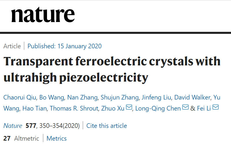 1月16日,英国《自然》期刊在线发表了西安交大压电单晶研究团队的最新学术成果:“Transparent ferroelectric crystals with ultrahigh piezoelectricity(具有超高压电效应的透明铁电单晶)”。