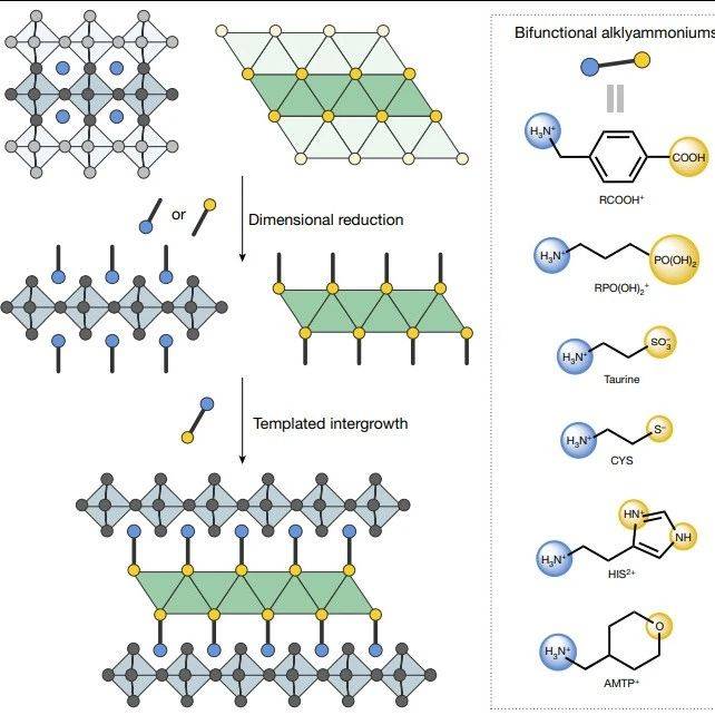 石墨烯和MoS2等不同二维(2D)结构的精确堆叠,重新激活了二维材料的领域,揭示了它们界面上的奇异现象。层状异质结构的本体合成几乎完全采用高温固相合成技术,从中可以分离出金属-氧化物、-硫化物、-磷化物和-卤化物基材料。这些物质通过一种叫做共生的过程形成,这是一种结构在另一种结构表面的结晶。更直接的定向插层和离子交换技术已经用于氧化物钙钛矿合成后制备微晶Bi-O和卤金属酸盐共生物的氧化钙钛矿。然而,这些材料所发现的结构多样性是有限的,每个结构都是来自受限反应空间的一个特殊例子。这些独特的界面通常采用机械或沉积的方法来一次构建一个单层的异质结构。相比之下,自组装是一种可扩展的技术,复杂材料可以在溶液中选择性地形成。层状有机-无机卤化物钙钛矿以其结构可调性和低温合成而备受关注。在层状钙钛矿中,有机或无机离子往往是烷基铵阳离子,通过形成有机双分子层对钙钛矿片层进行分区。通过调节有机阳离子的结构,可控地合成出一类广泛的卤化物钙钛矿。