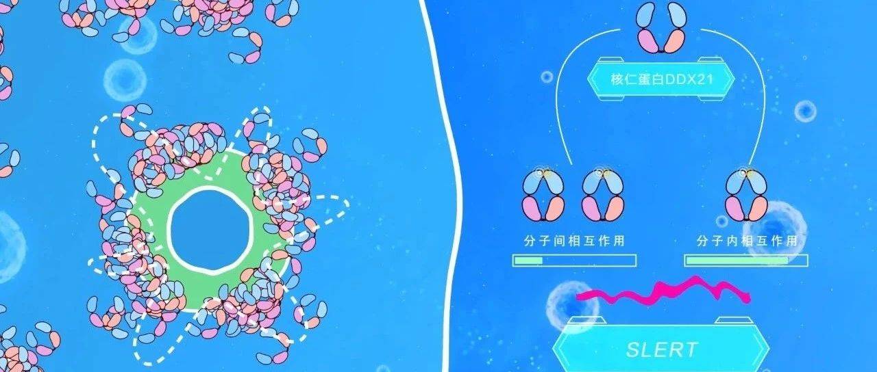 在此过程中,一种被称为SLERT的长非编码RNA通过与DDX21的特定结构域结合,以类似分子伴侣的机制促进DDX21发生构象变化。具体来说,在与SLERT结合后,DDX21从松散的构象转变为闭合构象。而闭合构象的DDX21聚集成松散的分子簇,使得FC/DFC单元具有足够的流动性和较为疏松的空间环境,供RNA聚合酶I高效转录;此外,松散的DDX21分子簇无法缠绕线性的核糖体DNA分子,也会促进转录的进行。