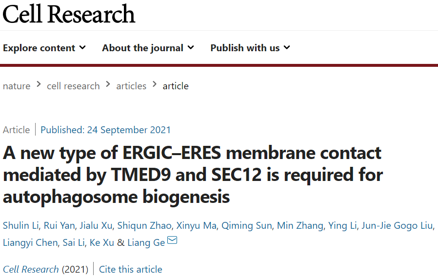 2021年9月24日,清华大学葛亮团队在Cell Research 在线发表题为“A new type of ERGIC–ERES membrane contact mediated by TMED9 and SEC12 is required for autophagosome biogenesis”的研究论文,该研究确定了在 ER-高尔基体系统中的 ER-高尔基体中间区室 (ERGIC) 和 ER 出口位点 (ERES) 之间形成的新型膜接触,这对于促进由不同胁迫刺激诱导的自噬体生物发生至关重要。