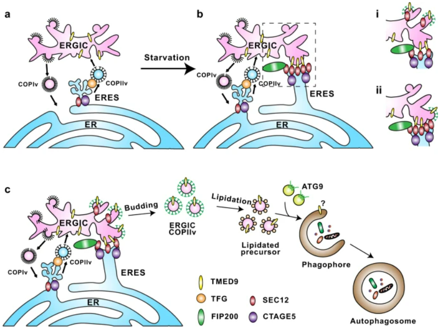 在这里,该研究使用无细胞脂化、免疫隔离和质谱法,将 ERGIC 蛋白 TMED9 鉴定为非选择性和选择性自噬中多重刺激下自噬体生物发生的关键调节因子。