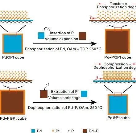 利用钯基纳米立方体内核在磷化/去磷化过程中的体积伸缩调控铂壳层晶格应变。论文作者供图