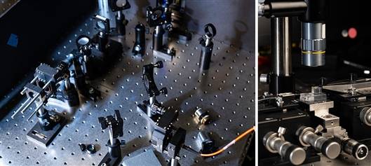 传统的干涉测量法(左)需要精心设置镜子和激光系统,所有这些都需要非常精心和仔细地对齐。宋美廷“将这些提炼出来,放入光子芯片中”,该芯片只需要一个显微镜(右图)。图片来源:罗彻斯特大学/ J. Adam Fenster