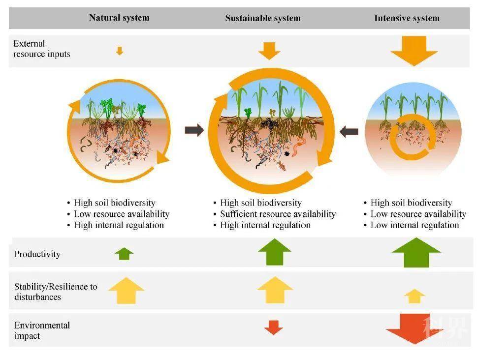 农业集约化对地上和地下生物多样性均有负面影响。传统的大规模农业通常采用破坏性的土壤管理方法,农业对化学药品的依赖包括化肥和杀虫剂会危害土壤生物和土壤功能。例如,氯化钾(KCl),一种常用的合成钾肥,含有高浓度的氯,一种能导致土壤生物死亡的生物杀灭离子。杀虫剂还会导致土壤生物多样性的丧失,因为它们可能会影响到有限的一类生物体或广泛的生物,这意味着它们不仅可能杀死“坏”生物,也可能杀死一些“好”生物。