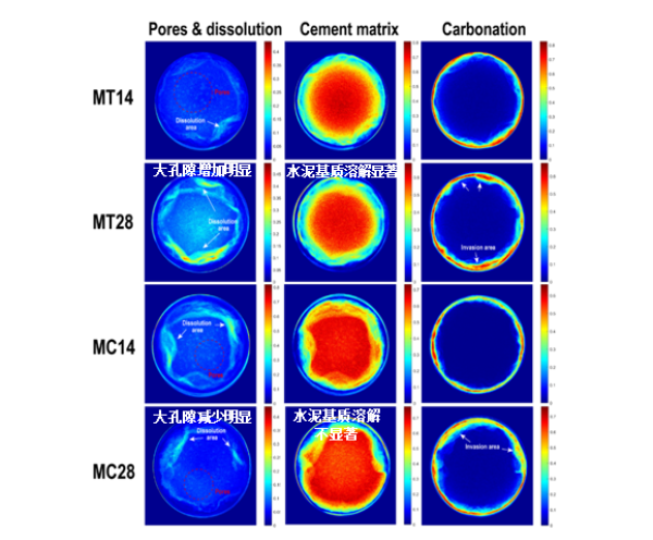 图3.井筒水泥对照组(MT)和改性组(MC)CO2腐蚀后大孔隙、水泥基质、碳化层分布图