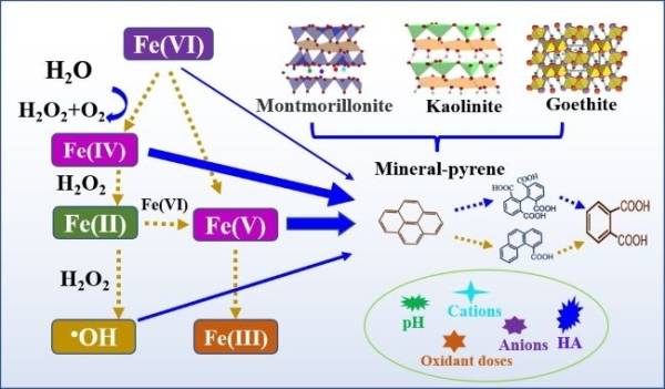 中国科学院南京土壤研究所研究员王芳课题组以芘为多环芳烃模式污染物,针对蒙脱石、高岭石、针铁矿等典型矿物,研究了高铁酸盐氧化降解矿物界面多环芳烃的过程和机制。研究发现在pH7~9范围内,高铁酸盐对矿物界面的芘具有高效降解作用,但降解效率与矿物类型以及高铁酸盐自分解有关。蒙脱石界面芘的降解在中性条件下具有最高的降解效率,其路易斯酸性位点有利于高铁酸盐氧化降解芘;而高岭石和针铁矿界面芘降解效率分别在pH 8和pH 9条件下最高。针铁矿存在下,芘降解速率最快,但同时高铁酸盐自分解也最快,导致的氧化剂无效损失也最大,因此,pH增大抑制高铁酸盐自分解,有利于针铁矿界面芘的降解。通过自由基和中间价态铁的淬灭实验,发现Fe(V)/Fe(IV)是主要的活性物质,对芘降解具有决定性作用。羟基自由基在高铁酸盐降解芘过程中的贡献(5.1%~27.4%)与矿物种类有关,蒙脱石的处理中最高。适量的过氧化氢和Fe3+有利于中间价态Fe(V)/Fe(IV)的生成,提高蒙脱石和高岭石界面芘的降解。研究通过LC-MS分析了高铁酸盐氧化降解芘的路径,发现可能存在两条不同的邻苯二甲酸产物路径。