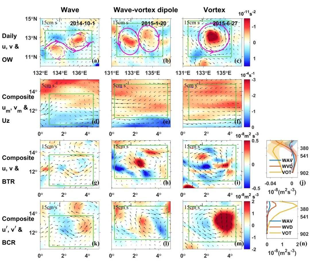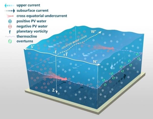 新发现的大尺度能量耗散混合的机制在于:2017年拉尼娜期间,新几内亚沿岸潜流的增强导致其携带更多的次表层南太平洋负位涡水跨过赤道后,进一步被较强的哈目黑拉涡携带到达5oN附近的北赤道逆流区,在此处较强的垂向地转剪切作用下,产生对称不稳定诱发湍流混合。该成果也是大尺度环流-中尺度涡旋-亚中尺度过程-小尺度湍流之间能量级串的一个典型例证,得到海洋混合研究方向专家美国布朗大学教授Baylor Fox-Kemper的高度赞赏。他在评审意见中认为该发现十分新颖且有较大应用价值,特别是对粗分辨率气候模式模拟具有重要参考价值。