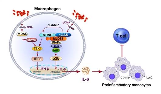 该研究证实了小鼠在致死性约氏疟原虫N67C感染后,疟原虫DNA可活化cGAS-STING并通过髓样分化因子MyD88激活p38信号通路,介导感染后期IL-6的产生,IL-6继而促进CD11b+Ly6Chi促炎单核细胞的扩增,从而抑制T细胞增殖、功能及宿主抗疟原虫免疫反应。