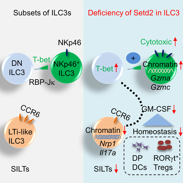 Setd2通过调控染色质开放程度而调控ILC3的各个亚群的分化和功能,进一步影响RORγt+Treg自稳态从而维持肠道的免疫稳态。