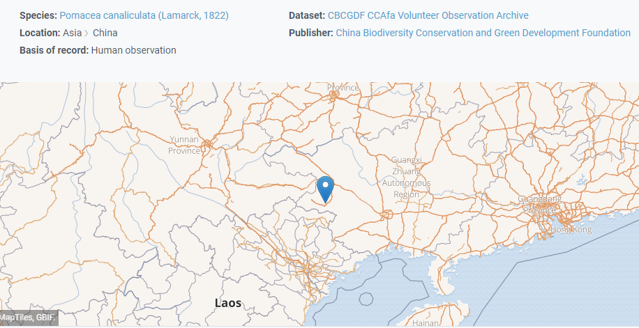 ◆全球生物多样性信息平台(GBIF)发布湖南湘潭和湖北赤壁福寿螺数据