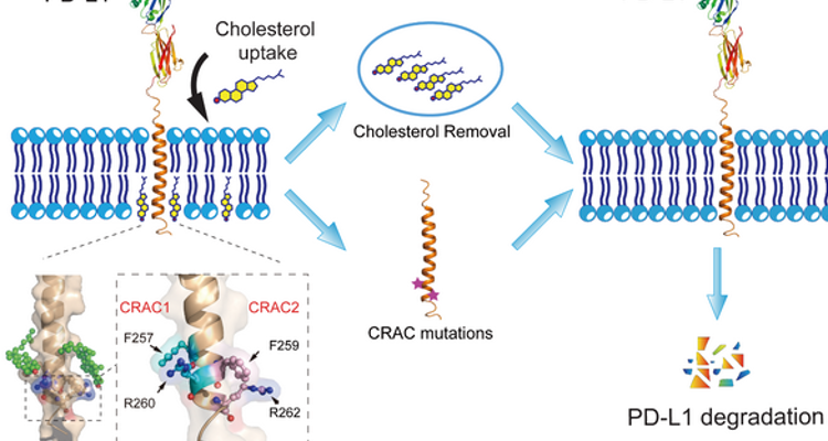 8月26日,中国科学院分子细胞科学卓越创新中心(生物化学与细胞生物学研究所)欧阳波研究组与天津医科大学科研人员合作,在Science Advances上,在线发表了题为Regulation of PD-L1 through direct binding of cholesterol to CRAC motifs的研究论文。该研究发现胆固醇分子可以直接与PD-L1跨膜段的两个CRAC基序结合,形成类似于“三明治”样的结构,来调控细胞膜上PD-L1的稳定性和降解。