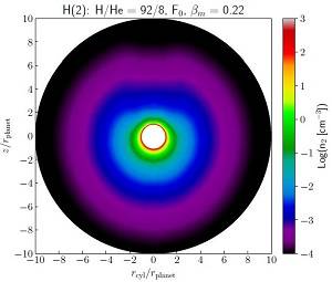 同时,他们还详细计算了亚稳态氦原子的分布,并模拟该系外行星在光学波段和近红外波段透射光谱观测数据,限定了行星接收到的恒星X射线和极紫外辐射水平,以及行星大气中的氢氦丰度比,推断出该行星周围存在膨胀且逃逸的中性氢和氦气体。这一成果将为行星大气理论研究提供新方法和参考。