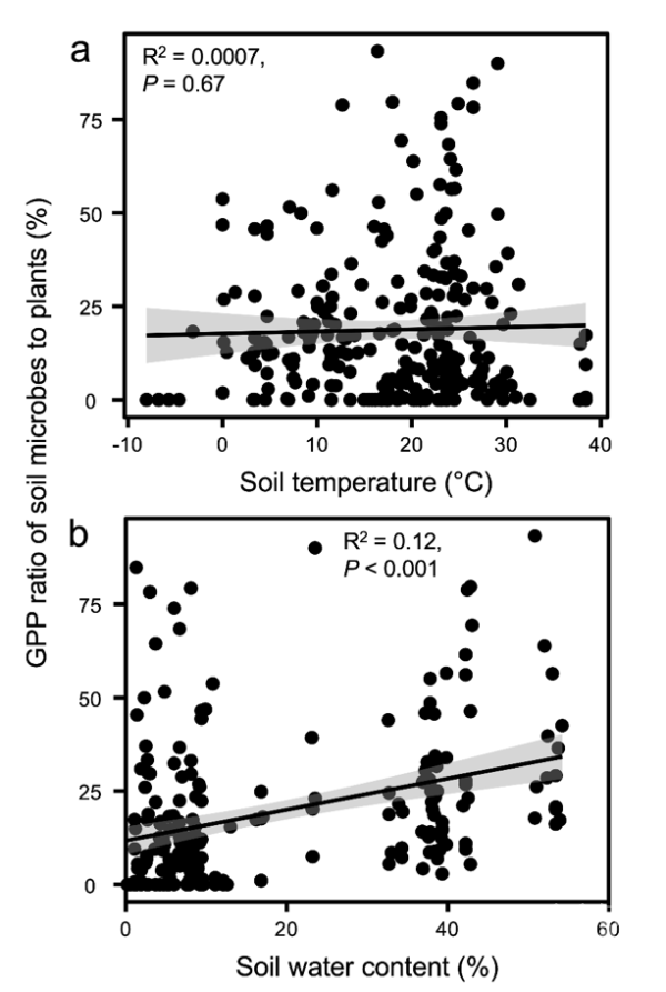 青藏高原生物地球化学循环中的四个重要限制为植物生长的温度限制、生态系统的氮限制、土壤微生物的碳限制和干旱半干旱生态系统的土壤水分限制。气候变暖直接缓解了高原植物生长的温度限制,促进了植物生长。而植物生长的增加,使其分配给地下的生物量(碳)也将增加,从而一定程度缓解了土壤微生物的碳限制(图3)。加之增温效应的影响,土壤微生物的活性进一步增强,特别是氮循环相关微生物的活性增强,会缓解生态系统的氮限制。另外,对于受土壤水分限制的干旱半干旱生态系统而言,土壤水分变异性的加剧或缓解土壤水分的限制,从而决定这些生态系统对全球变化响应的方向和强度。气候变化和人为活动导致了冰川和冻土融化,同时,轻度或者中度放牧通过采食降低了草地的地上生物量,但一定程度上增加草地的地下生物量,向草地输入了富含氮的粪便,这有助于维持草地土壤碳氮储量。而重度放牧和严重的冻土融化一方面增加了土壤侵蚀和有机碳矿化,一方面减少了植物碳的输入,导致青藏高原土壤碳氮大量损失。