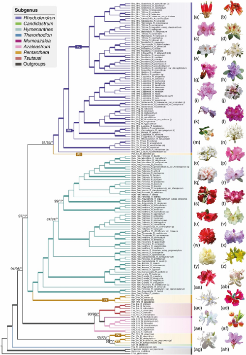 杜鹃花属(Rhododendron)是北半球最大的木本植物属,也是我国种子植物最大的属,在全球有1000余种,其中中国约590种。快速辐射演化和频繁的自然杂交事件使得杜鹃花属分类和系统发育研究存在挑战性。横断山和喜马拉雅地区是全球杜鹃花属植物分布和分化中心之一,拥有该属物种320余种,其中约三分之二为区域特有种。因此,杜鹃花属在横断山和喜马拉雅地区的多样化历史备受关注。